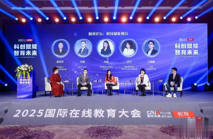 在“科技赋能教育”圆桌论坛中,赵战术副总编与新东方比邻CEO乔蕾、君诚国际双语学校学术校长宋晶、新航道好轻松考研事业部总经理助理武文、高途英语教育专家王双林等嘉宾,围绕科技创新在教育教学中的深度融合展开讨论,探索如何通过科技手段推动教育高质量发展。